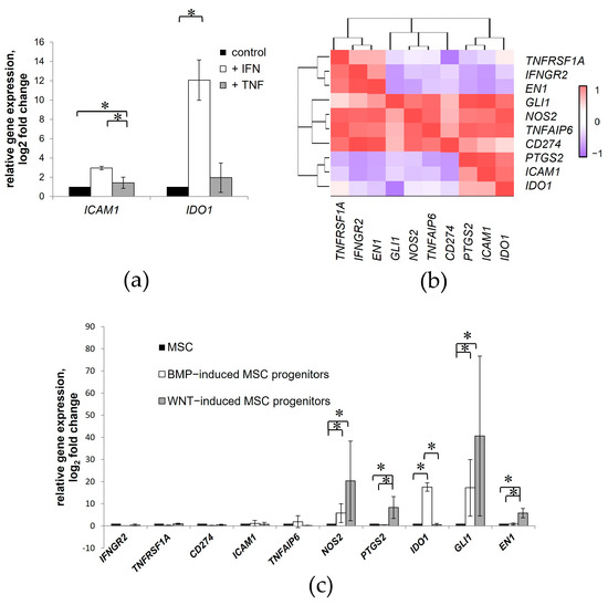 The most pronounced difference between the WNT- and BMP-induced MSC progenitors was observed in the expression of PTGS2, TNFRSFA1, and CD274 upon TNF-α treatment. The BMP-induced MSC progenitors exhibited increased PTGS2 expression. In contrast, the PTGS2 expression was downregulated in the WNT-induced MSC progenitors under the same conditions. At the same time, the difference in the expression of PTGS2 was not statistically significant between the WNT- and BMP-induced MSC progenitors in response to stimulation with IFN-γ. TNFRSFA1 expression was upregulated in the WNT-induced MSC progenitors but downregulated in the BMP-induced MSC progenitors upon both IFN-γ and TNF-α treatment. Stimulation with IFN-γ and TNF-α resulted in the increased expression of CD274 in both the WNT- and BMP-induced MSC progenitors. However, the difference in CD274 expression was statistically significant only after TNF-α application (Figure 8a). In addition, these cells showed opposite responses in the expression of TNFA1P6, INFGR2, EN-1, and GLI1 in response to inflammatory stimuli. However, in this case, the differences between the WNT- and BMP-induced MSC progenitors were not statistically significant. On the other hand, the WNT- and BMP-induced MSC progenitors responded similarly to IFN-γ treatment, increasing IDO1 and ICAM1 expression. Conversely, the expression of these genes was downregulated in both types of cells when exposed to TNF-α. Stimulation with IFN-γ and TNF-α resulted in decreased NOS2 expression in both the WNT- and BMP-induced MSC progenitors.