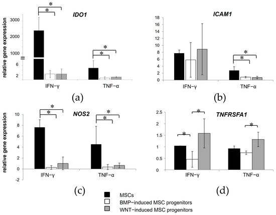Relative mRNA expression of IDO1 (a), ICAM1 (b), NOS2 (c), and TNFRSFA1 (d) in the BMP- and WNT-induced MSC progenitors and the MSCs differentiated from iPSC after IFN-γ and TNF-α treatment. Data are normalized to basal expression levels in the same cell lines without stimulation. Data are represented as mean ± SD, n = 3 independent experiments. t-test, * reliability of differences at p < 0.05.