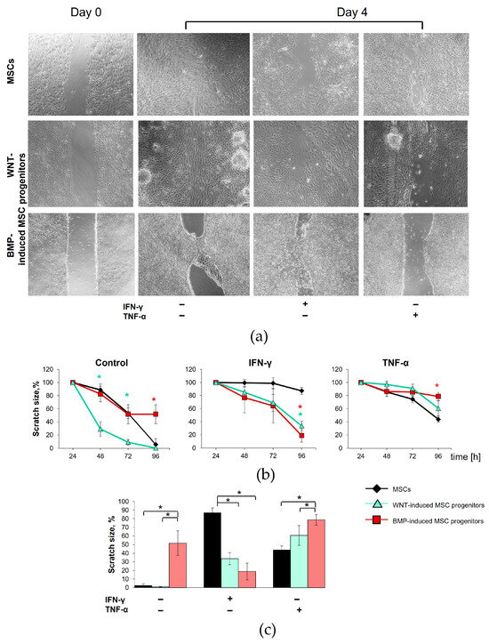 In order to assess the functional activity of the isogenic mesodermal derivatives differentiated from iPSCs in the proinflammatory microenvironment, a wound scratch assay was performed. The migration rate was compared between the WNT- and BMP-induced MSC progenitors and their isogenic MSCs upon the addition of TNFα or IFN-γ. The cells in the medium alone were used as a control. The scratch size was initially set to be 100%, and wideness was measured at different time points.
