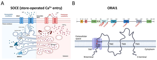SOCE (store-operated Ca2+ entry) and ORAI1 domains. (A) In normal conditions, reticular Ca2+ store depletion induces STIM1 unfolding, oligomerization, and interaction with ORAI1 to trigger extracellular Ca2+ entry (left). In TAM/STRMK, ORAI1 gain-of-function (GoF) mutations generate a leaky channel and induce excessive Ca2+ influx independently of the reticular Ca2+ load and STIM1 binding, resulting in elevated Ca2+ levels in the cytosol and the reticulum (right) [9]. (B) Schematic representation of the ORAI1 protein domains with position of the described GoF mutations (above). ORAI possesses 4 transmembrane domains (TM1–TM4). G97C, G98S, and V107M affect conserved amino acids in TM1, forming the channel pore (below). R = arginine-rich, P = proline-rich, CAD = CRAC channel activating domain; R/K = arginine/lysine-rich.