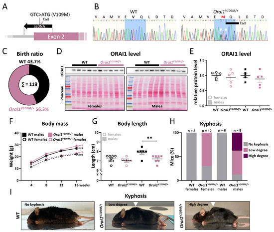 Generation of Orai1V109M/+ mice and postnatal follow-up. (A) The ORAI1 V109M mutation was introduced into murine C57BL/6N ES cells using a single-strand DNA (ssDNA) and CRISPR/Cas9 technology. (B) Sanger sequencing confirmed the heterozygous GTC>ATG codon change (arrowheads) and the introduction of a TseI restriction site (GCWGC) in Orai1 exon 2. (C) Orai1V109M/+ mice were born with Mendelian ratio. (D,E) Western blot on muscle samples and quantification of signal intensities revealed similar ORAI1 protein levels in WT and Orai1V109M/+ mice. (F) Postnatal weight gain was comparable in WT and Orai1V109M/+ mice from 4 to 16 weeks. (G) At 4 months, Orai1V109M/+ males were smaller than WT littermates. Significant differences are indicated as ** p < 0.01. (H) Moderate or severe kyphosis was noted in the majority of Orai1V109M/+ mice at 4 months and was absent in WT littermates. (I) Representative images showing kyphosis (arrowheads) in Orai1V109M/+ males.