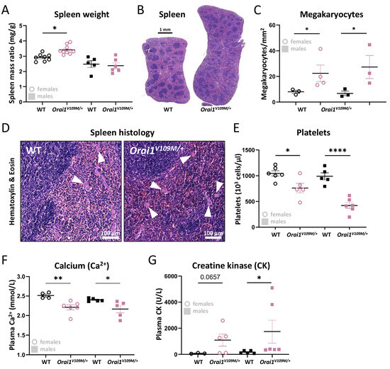Spleen anomalies are typical features in TAM/STRMK patients and STIM1 mice but were not noted in the existing Orai1G98S/+ mouse model [7,10,11,12,16,17,20,21,23,24,28,29,30,31,32,33]. An increase in spleen weight by 17% was observed in Orai1V109M/+ females, while spleens from Orai1V109M/+ males were indistinguishable from the WT (Figure 3A,B). However, histological analyses of spleen sections revealed megakaryocyte hyperplasia associated with abnormal megakaryocyte distribution in both Orai1V109M/+ males and females compared with WT littermates (Figure 3C,D). Megakaryocytes produce and release thrombocytes into the bloodstream, where they form hemostatic plugs at sites of vascular injury [34]. In TAM/STRMK patients and murine STIM1 models, thrombocytopenia is concomitant with prolonged bleeding times [7,10,11,15,16,17,20,21,23,28,29,30,31,32,33,35,36], and accordingly, Orai1V109M/+ mice displayed a reduction in circulating platelets (Figure 3E). Biochemical tests on Orai1V109M/+ blood samples also revealed hypocalcemia (Figure 3F), commonly observed in TAM/STRMK patients [6,11,15,16,17,31,33,37], as well as a tendency of elevated creatine kinase levels (CK, Figure 3G), a typical feature of TAM/STRMK and other muscle disorders involving myofiber degeneration [9,12,38].