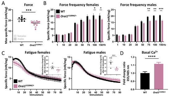 Abnormal muscle function in Orai1V109M/+ mice. (A) Force transduction experiments disclosed reduced maximal force of Orai1V109M/+ tibialis anterior compared with WT. (B) Increasing stimulation frequencies evidenced normal submaximal force in Orai1V109M/+ mice but reduced maximal force compared with WT littermates. (C) Orai1V109M/+ mice showed abnormal fatigue curves with absence of muscle force increase in Orai1V109M/+ males after 10 stimulations and a similar tendency in Orai1V109M/+ females (insets). (D) Ratiometric analyses revealed increased resting Ca2+ levels in isolated Orai1V109M/+ myoblasts compared with WT controls. Significant differences are indicated as * p < 0.05, ** p < 0.01, *** p < 0.001, and **** p < 0.0001.