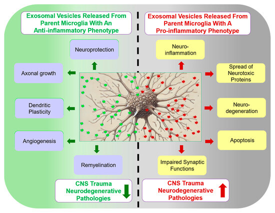 The function of microglial exosomes is influenced by the phenotypic state of the parent cell. Exosomal vesicles released from anti-inflammatory microglia are depicted in green, representing their neuroprotective and pro-regenerative roles (indicated by green arrows). In contrast, EVs derived from pro-inflammatory microglia are shown in red, indicating their association with heightened neuroinflammation, cell death and neurodegenerative conditions (indicated by red arrows).