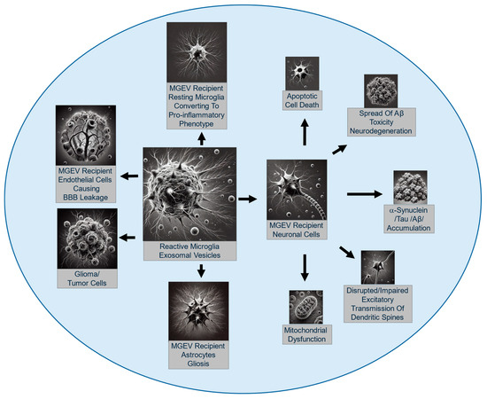 The mechanisms by which MGEVs exert their effects is similar to EVs from other cell types and involves the direct transfer of bioactive molecules to recipient cells, the modulation of receptor-mediated signaling pathways, and gene expression changes driven by exosomal miRNAs and other regulatory RNAs [7,112]. MGEVs transfer their cargo constituting miRNAs or proteins that regulate inflammatory signaling cascades in the recipient cells, either by amplifying or dampening neuroinflammatory responses [17,86,90,113,114]. In neuropathological conditions, the role of MGEVs in intercellular communication is important. MGEVs can convey signals that either promote the clearance of insoluble protein aggregates, such as amyloid-beta (Aβ) in Alzheimer’s disease [115], or propagate the spread of pathogenic proteins, such as tau or α-synuclein [25,116,117]. MGEVs, like exosomes from most other cell types, can cross the blood–brain barrier (BBB) [118,119,120]. Using in vitro models, it was demonstrated that MGEVs from reactive microglia dramatically enhanced the permeability of the BBB while reducing the expression of BBB-related proteins like Claudin-1, occludin, and ZO-1. In contrast, MGEVs from resting microglia did not alter the integrity of the BBB [120]. Thus, MGEVs not only mediate local immune responses but, due to their ability to cross the BBB, can affect target cells at a distance and systemically or even be employed as vehicles for delivering therapeutic agents to the brain.