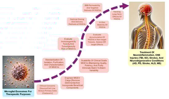 As of now, the FDA (U.S. Food and Drug Administration) has not approved any exosome-based therapies for clinical use. Exosomes from disparate parent cells are under investigation in various preclinical and clinical studies for their potential in treating a range of conditions, including cancer, neurodegenerative diseases, and other disorders. In recent years, exosomes have been explored in preclinical and clinical studies for various neurodegenerative conditions such as AD, PD, and stroke [217]. Several studies in experimental models of CNS injury and disease have demonstrated the therapeutic benefits of Schwann cell (SC)-, mesenchymal stem cell (MSC)-derived, and neural stem cell (NSC)-derived EVs [218,219,220,221,222], with more recent research highlighting the potential of the repeated administration of allogeneic Schwann cell-derived EVs in an FDA-approved single patient study with ALS that did not exhibit any adverse effects towards SCEV administration [223]. However, to date, no clinical trials have been conducted for MGEVs. To successfully translate the preclinical successes of modulated MGEVs into clinical studies, it will be necessary to gain a deeper understanding of consistent therapeutic outcomes, pharmacokinetics, biodistribution, and long-term effects in humans, particularly to address regulatory and safety challenges (Figure 5).