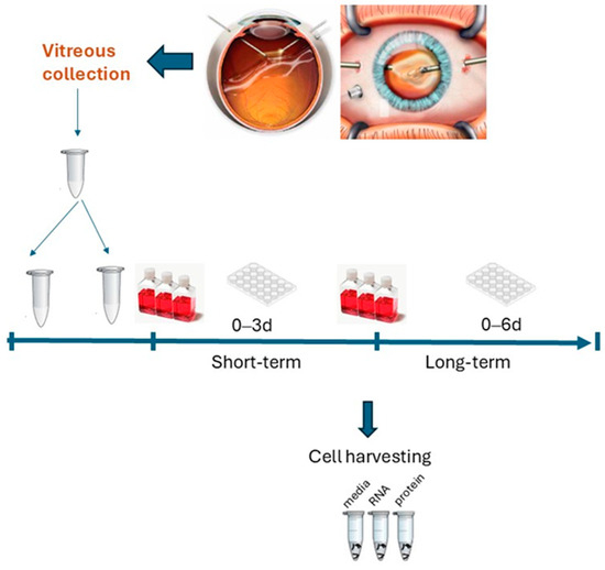 Untouched vitreous fluid was collected from the central vitreous cavity, at the beginning of the 25/27-gauge pars plana mini-invasive vitrectomy (2000 starting cuts). The organoleptic features of the sampled vitreous can be defined in terms of the jelly-to-liquid appearance, volume (250–800 µL), and total protein content (150 ng/µL). The vitreous was left at room temperature for 15 min to allow sedimentation and supernatants were gently removed by centrifugation (1500 rpm for 3 min). Pellets including cells and matrix were gently resuspended in a 15 mL conical tube containing Iscove’s modified Dulbecco’s medium (IMDM; Waltham, MA, USA) supplemented with 10% fetal bovine serum (FBS), 1% glutamine, and 100 units/mL mix penicillin/streptomycin [15]. To increase the rate of hyalocyte isolation and maximize the beads-separation, the vitreous was further incubated at 37 °C under gentle shaking in the presence of collagenase (1 mg/mL; Sigma, Milan, Italy) followed by dispase II for an additional 30 min. After enzymatic digestion, the vitreous bodies were centrifuged at 300× g for 5 min and pellets were used for bead-driven cell separation (antiCD45 and antiCD11a cocktail), according to a standard procedure [15]. Cell-culture biodegradable beads were conjugated with a mix of CD45 and CD11a antibodies 1:10 diluted in PBS containing 0.05% Tween (PBST) and left at room temperature for antibody–bead complex formation according to a standard procedure [15]. For separation, cells were placed in a medium and incubated at 37 °C in the presence of 5% CO2 with partial medium refreshing every day (1:1; vitreous medium). In preliminary tests, different media and different enzymatic procedures were tested according to the literature. For these studies, untouched or enriched/selected cells were seeded in collagen-coated 24-well plates (1000 cells/250 μL) in the presence of 1:1 vitreous medium, and after, 3 d cells were sampled or shifted in IMDM (1% FBS supplemented Iscove’s Modified Dulbecco’s Medium containing 1% antibiotic mix) until 6 d.
