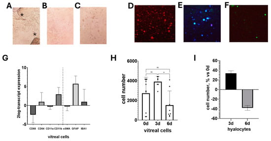 Human hyalocytes in 3 d and 6 d cultures. Phase contrast microscopy of monolayers acquired from vitreous cells (A–C) and hyalocytes (D–F) cultured and analyzed after 3 d and 6 d from seeding (0 d). In the light microscope acquisitions, no stains nor dyes were used for evaluation (A–C). Note the different cell densities depending on the characteristics of the specimens (A–F). (×200, original magnification) Untouched cells displayed different markers of macrophage lineage (G) as detected by PCR analysis. A selected transcript analysis of vitreous cells displays a typical pattern of differentiation (G). The cell survival profile of enriched vitreous cells (H) showed an increased cell number at 3 d and a significant reduction at 6 d (I) with respect to 0 d. The decrease between 6 d and 3 d was significant (p < 0.05; ns not significant, ANOVA Tukey–Kramer post hoc). Bead-selected hyalocytes showed an increase at 3 d and a decrease at 6 d from culturing, with respect to 0 d (C). * p < 0.01.