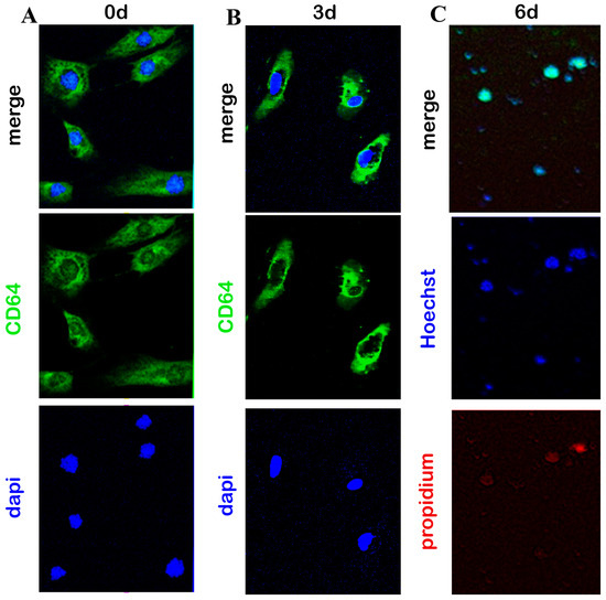Immunophenotypical characterization. Epifluorescent images of hyalocytes double-stained with CD64/dapi (A) or triple-stained with CD64/Hoechst/propidium (B). Cells were seeded (1000 cells/well) in 24 well tissue-culture plates and collected at 3 d and 6 d from initial plating (baseline; 0 d). Adherent cells were postfixed and immunostained. Representative images of bead-separated hyalocyte (CD45/CD11a/CD64) cells cultured on round coverslips and imaged at 3 d (B) and 6 d (C) from initial plating (A). Overlay images (upper) display immunoreactivity at 0 d (A), 3 d (B), and 6 d (C); middle layers show CD64 (cy2/green) immunoreactivity changes and lower panels show nuclear intercalants (Hoechst/dapi/blue). (Original magnification ×400).