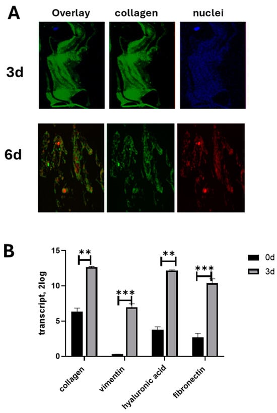 Matrix protein transcripts (collagen, fibronectin, and vimentin) were significantly upregulated at 3 d (Figure 4B) while significantly reduced at 6 d of culturing.