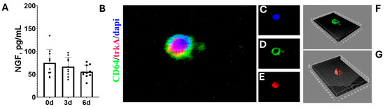 NGF and trkANGFR expression as a function of culturing. Cells were seeded (1000 cells/well) in 24 well tissue-culture plates and harvested at 3 d and 6 d from initial plating (baseline; 0 d) for NGF quantification or they were immunostained for trkANGFR examination. (A) NGF protein expression as a function of culturing (0 d, 3 d, and 6 d; ANOVA Tukey–Kramer post hoc). Representative epifluorescent images of 3 d hyalocytes (CD45 and CD11a pos selection) cultured for 3 d and identified by nuclear counterstained with dapi (blue; (B)) and double-immunostained for CD64 (green) and trkANGFR (red). As shown in overlay (B), CD64 was mainly localized at the membrane level (green; (D)) and equally distributed, while the trkANGFR receptor appears in membrane zones (red; (E)), nuclei were stained with dapi (C). This distribution cluster of trkANGFR is more visible in the interactive 3D surface plot compared to the CD64 uniform distribution ((F) vs. (G); ImageJ). The nuclear localization by DNA intercalant (dapi/blue) is suggestive of signal specificity. Original magnification ×400 for Merge and single acquisitions.