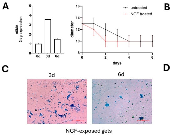 Since a common characteristic of vitreoretinal disorders is retinal retraction, hyalocytes were tested for their potential ability to in vitro contract an ECM scaffold (retained ability to contract a collagen matrix). As shown in Figure 7A, cultured hyalocytes harvested at 3 d showed an increased expression of transcripts specific for αSMA, a classic myofibroblast marker, which decreased at 6 d, reaching quite the initial expression. A 3D collagen gel contraction test was thereafter performed in the presence or absence of supplemented NGF. As shown in Figure 7B, hyalocytes were able to retract the collagen matrix either alone (back line) or in the presence of exogenous NGF (red line). The addition of NGF was used as an alternative to TGFβ1 as a positive control. This hyalocyte reactivity to NGF exposure in a 3D-gel contraction system is shown in Figure 7B. Representative gel-embedded hyalocytes at 3 d and 6 d are shown in Figure 7C,D.