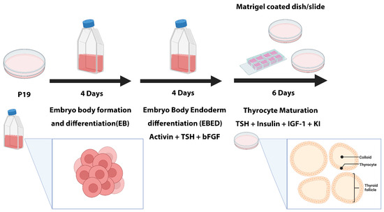 The established procedure to induce P19 differentiation into thyrocytes is shown in Figure 1. Firstly, P19 cells were seeded in a non-adhesive flask to form embryoid bodies (EBs) for four days. Activin A, TSH, bFGF, and 10% of endoderm induction medium were added to induce EB endoderm formation and differentiation (EBED) containing the thyrocyte progenitor lineage for four more days. The EBED aggregates were then dissociated into single cells and plated on the Matrigel-coated dish in the serum-free medium supplemented with TSH, Insulin, IGF-1, and KI, allowing the cells to differentiate into thyrocytes and form follicle-like structures. Mature thyrocytes were polarized with their apical membrane facing the colloid, the inner part of the follicle, and the basal membrane facing the outer part of the follicle, as shown in the bottom right of Figure 1. In these structures, thyrocytes are functional, as indicated by their ability to produce and release TG.