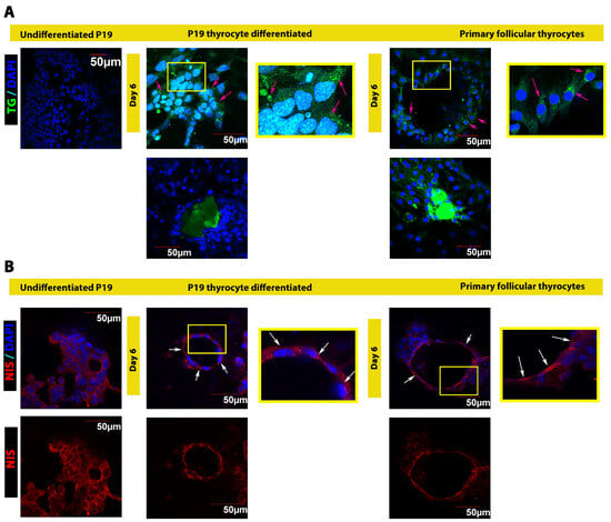 Functional thyrocytes produce and secret TG to the colloid located in the follicle’s center. Follicles form through thyrocytes rearrangement so that the apical surface of polarized thyrocyte faces the center, the colloid. As shown in Figure 4A top panel (middle and right), the expression and accumulation of intracellular TG in P19 differentiated thyrocytes were comparable to that of primary follicular thyrocyte cultures. TG was distributed evenly throughout thyrocytes in both primary follicular thyrocytes and P19 differentiated thyrocytes (magenta arrows in Figure 4A top panel middle and right). In contrast, P19 stem cells did not express TG (Figure 4A top panel left). In the thyroid gland, thyrocytes form follicles by polarizing the apical surface toward the colloid where TG is secreted (the sphere’s center). P19 differentiated thyrocytes formed follicle-like structures, and appeared in a hemispherical or circular shape because the coating material of the dish did not provide a 3D environment, which remains to be improved (see Section 4). Both P19 differentiated thyrocytes, and primary follicular thyrocytes exhibited very similar circular shapes (Figure 4A top panel middle and right). In addition, both cultures secreted TG, which accumulated in the center of follicle-like structures (Figure 4A bottom panels). Despite the continuously increased expression of TG in the P19 differentiated thyrocytes for up to day 6 of maturation, TG protein expression was lower in P19 differentiated thyrocytes as compared to TG expression in primary follicular thyrocytes extracted from follicles of 3-month-old thyroid glands. This suggests a room for improvement to optimize the functional maturation of this in vitro thyrocyte differentiation and maturation model.
