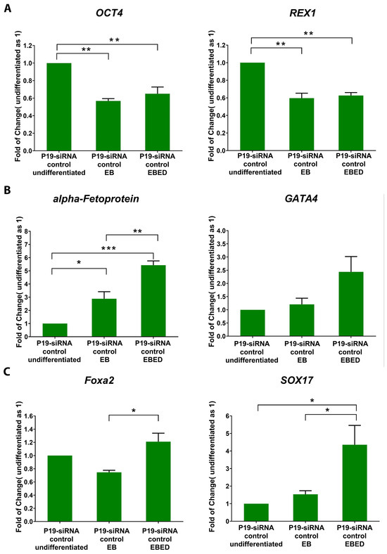 Gene expression patterns at different stages of P19-siRNA control culture transitioning from undifferentiated state to EB endoderm differentiation (EBED) stage. (A) Expression of stemness genes OCT4 and REX1 in P19-siRNA control, including stages of undifferentiated, EBs, and EBED. (B) Expression of endoderm-specific genes: α-fetoprotein and GATA4 in P19-siRNA control, including stages of undifferentiated, EB, and EBED. (C) Expression of genes specific to thyrocyte progenitors and definitive EBED: Foxa2 and SOX17 in P19-siRNA control, including undifferentiated, EB, and EBED. The data show means ± SE of 3 independent experiments. One-way ANOVA followed by Bonferroni post hoc analysis was performed, * p <0.05, ** p < 0.01, *** p < 0.001.