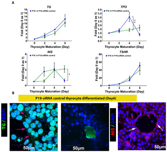 Gene expression patterns and immunostaining of P19-siRNA control differentiated into thyrocytes. (A) Expression patterns of genes specific to thyrocyte functions: TG and TPO, and those enriched in thyrocytes, NIS and TSHR in P19-wild type and P19-siRNA control cultures thyrocytes differentiated. (B) Immunostaining of TG and NIS in P19-siRNA control cells-differentiated follicle-like structures. Left panel, intracellular TG was distributed evenly in P19-siRNA control cells-differentiated thyrocytes (magenta arrows), and secreted TG accumulated inside the follicle (middle panel). Right panel, NIS was detected in P19-siRNA control cells-differentiated thyrocytes only on one side of the cells, indicating the expected polarity of these differentiated thyrocytes (white arrows). The heatmaps/histograms of TG and nuclear staining were obtained, shown in Figure S2. Panel A data show means ± SE of 3 independent experiments. Two-way ANOVA followed by Bonferroni post hoc analysis was performed, * p <0.05, ** p < 0.01.