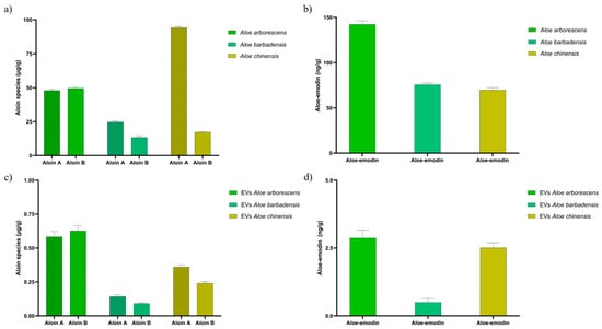 Quantification of aloin A, aloin B, and aloe-emodin through Q-TOF LC/MS analysis in Aloe arborescens, Aloe barbadensis, and Aloe chinensis plant extracts (a,b) and respective EVs (c,d). Data are reported as µg of aloin species or ng of aloe-emodin per g of fresh leaves’ material and expressed as mean ± SD (n = 5).