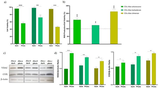 The cytotoxicity and phototoxicity (a) as well as ROS production (b) of Aloe EVs (1:50 dilution ratio) on SK-MEL-5 cells. Cytotoxicity (Dark) was evaluated on cells kept in the dark, while phototoxicity (Photo) and ROS production were assessed after 50 min of irradiation (corresponding to irradiation energy of 2.55 J/cm2, λexc = 390−400 nm). Cell viability is expressed as the mean of three independent experiments of four replicas each ±SD; 100% corresponds to control (untreated cells kept in the dark and photoexposed for Dark and Photo, respectively) mean values. * p < 0.05, ** p ˂ 0.01, *** p ˂ 0.001, **** p ˂ 0.0001. (c) Immunoblotting of SK-MEL-5 cells treated with Aloe arborescens, Aloe barbadensis, and Aloe chinensis EVs before and after UV irradiation. (d) Expression levels of VDAC and COX analyzed by Image J Software; β-actin was used as the internal control.