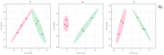 PCA score plots of SK-MEL-5 treated with Aloe arborescens (A), Aloe barbadensis (B), and Aloe chinensis (C) EVs kept in the dark (Dark, red) and after photoexposition (Photo, green).