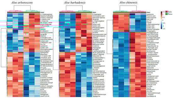 To further discriminate the Dark and Photo groups of treated cells, a statistical analysis was performed by using the t-test. In particular, in the case of photoexposed Aloe EV-treated cells, 68, 88, and 101 metabolites were annotated, respectively, representing 17%, 22%, and 25% of all of the detected metabolites (Tables S1–S3). A heatmap was then created to highlight the 50 significantly altered metabolites in the two metabolomes (Figure 6). The phenotypic expression of the fifty metabolites’ pathways was significantly altered after the treatment, revealing strong-separate clustering among the analyzed metabolomes. In particular, the rows show the metabolites, and the columns characterize the sample (red for the dark, green for the photoexposition). Significantly decreased metabolite regulation is shown in blue, while noticeably increased metabolites are presented in red. The alterations of these metabolites are mainly involved in the metabolism pathways of amino acid synthesis; in the metabolism of sphingolipids, glycerophospholipids, and fatty acids; and in the metabolism of purines and pyrimidines, indicating and confirming the evidence of strong cellular oxidative stress induced by the photoexposition and changes in cellular energy metabolism that could promote the apoptotic process.