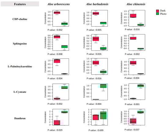The amino acid metabolism was also deeply altered following the treatment; in fact, in all three metabolomes, the level of histidine, one of the essential amino acids for cell proliferation, significantly decreased, as well as the metabolism of glutamine and aspartic acid (A. arborescens), or asparagine (A. barbadensis and A. chinensis). Noteworthy is the increase in cysteic acid resulting from the irreversible oxidation of cysteine in all three metabolomes. The presence of this molecule supports the hypothesis of oxidative stress induced by the photoexposition as it has been demonstrated that cysteic acid is formed in an environment characterized by a high concentration of ROS. In this case, it thus represents an important marker of oxidative stress and protein deterioration [60,61].