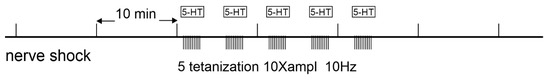 In each experiment, stimulus intensity was adjusted to evoke EPSPs of 4–10 mV amplitude from each stimulated nerve in withdrawal interneurons. In control experiments aimed at studying basic synaptic plasticity, test stimulation of the second cutaneal or intestinal nerves was carried out throughout the recording session with an interval between stimuli of 10 min. To study the long-term plasticity, a homosynaptic potentiation protocol was used. At the beginning of the recording, five test stimulations of the second cutaneal or intestinal nerves were performed with an interval between stimuli of 10 min, and then tetanization of the second cutaneal or intestinal nerve was carried out (a burst of stimuli with a frequency of 10 Hz, a burst duration of 10 s, a 10-fold increase in the amplitude of the test stimulus). In total, tetanization trains were delivered five times with an interval of five minutes (Figure 1). Before each tetanization, 5-HT was added to the experimental bath, which was washed off two minutes after the tetanization. After the fifth tetanization, test stimulation of the second cutaneal or intestinal nerve was continued at the original stimulus amplitude every 10 min for at least 4 h.