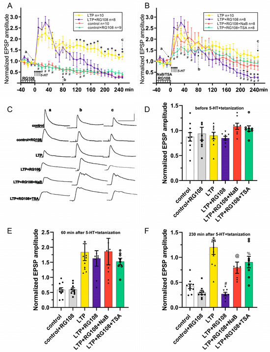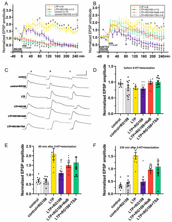 The effects of RG108, sodium butyrate (NaB) and trichostatin A (TSA) on EPSP amplitudes in control, under LTP induction and LTP maintenance in withdrawal interneurons with test stimulations of the second cutaneal nerve. (A) Effects of the bath applications of RG108 on the EPSPs: a time course plot of pooled data for the EPSPs. RG108 reduces LTP duration. * denotes p < 0.05 LTP+RG108 vs. LTP; # denotes p < 0.05 LTP+RG108 v vs. control. (B) Effect of the combined bath application of RG108 with either NaB or TSA on the EPSPs: a time course plot of pooled data for the EPSPs. Histone deacetylase inhibitors (NaB or TSA) prevented the weakening of potentiation. * denotes p < 0.05 LTP+RG108+NaB vs. LTP+RG108; # denotes p < 0.05 LTP+RG108+TSA vs. LTP+RG108. The data are presented as mean ± standard error of the mean. The duration of drugs’ presence is shown as a striped bar at the bottom in (A,B). Arrows indicate the time of tetanization+5-HT applications in (A,B). (C) Example traces of the EPSPs (a, b and c from plots (A,B)) in control, control+RG108, LTP, LTP+RG108, LTP+RG108+NaB and LTP+RG108+TSA groups. Scale bars:5 mV, 500 ms. (D) Comparison of the effects of RG108, NaB and TSA before the tetanization+5-HT. No differences were observed between EPSP amplitudes in groups before 5-HT+tetanization (time point 0 min) (E) Comparison of the effects of RG108, NaB and TSA on LTP induction: EPSP amplitudes 60 min post-5-HT+tetanization (time point of 80 min). EPSP amplitudes of LTP group were significantly higher than those in control; * denotes p < 0.05 LTP vs. control. Moreover, there were no significant differences between the groups with LTP induction. (F) Comparison of the effects of RG108, NaB and TSA on LTP maintenance: EPSP amplitudes 230 min post-5-HT+tetanization (time point 250 min). Application of RG108 caused a significant decrease in EPSP amplitude, while co-administration of RG108+NaB or RG108+TSA was shown to enhance LTP. * denotes p < 0.05 LTP vs. control; # denotes p < 0.05 LTP vs. LTP+RG108; @ denotes p < 0.05 LTP+RG108 vs. LTP+RG108+NaB; % denotes p < 0.05 LTP+RG108 vs. LTP+RG108+TSA.