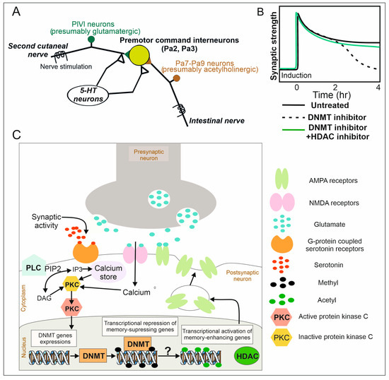 Epigenetic regulation of LTP in the withdrawal behavior of interneurons in terrestrial snails. (A). The neural network underlying LTP formation. (B). Inhibition of DNMT activity inhibits late LTP without affecting induction and early LTP, while the combined use of HDACi with DNMTi prevents potentiation attenuation. (C). Proposed model of epigenetic regulation of LTP in premotor interneurons with the example of glutamatergic presynaptic input. The induction and stabilization of LTP require NMDA and 5-HT receptor activation. This leads to the burst of intracellular calcium, synthesis of inositol 1,4,5-trisphosphate (IP3, mobilizing calcium from calcium stores) and diacylglycerol (DAG) from phosphatidylinositol 4,5-bisphosphate (PIP2) (phospholipase C (PLC) catalyses the hydrolysis of PIP2). DAG and/or an increase in the intracellular calcium act as activators of protein kinase C (PKC). The latter regulates the expression of DNMT genes. Alterations of DNMT genes’ expression in turn may cause changes in the methylation status of various plasticity-related genes. Moreover, DNA methylation somehow (“?” on the picture) affects the histone acetylation level. Successful activation of these signaling pathways leads to an increase in the number of AMPA receptors and, consequently, the synaptic strength.