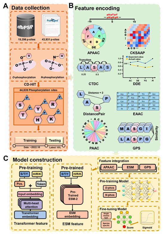 The procedure for the development of the GPS-pPLM, including data collection, feature encoding, and model construction. (A) Data preparation of p-sites curated from the literature and dbPSP 2.0. (B) Sequence feature encoding of the GPS-pPLM algorithm. In total, 8 types of sequence features were used, including APAAC, CKSAAP, CTDC, DDE, distance pair, EAAC, PAAC, and GPS. (C) Model construction methods used for GPS-pPLM. Two machine learning approaches, including transformer and DNN, were used for the construction of predictive models. We pretrained two general models, the O-phosphorylation model and the N-phosphorylation model, and then the pretrained models were fine-tuned using data specific to a single-residue type or species.