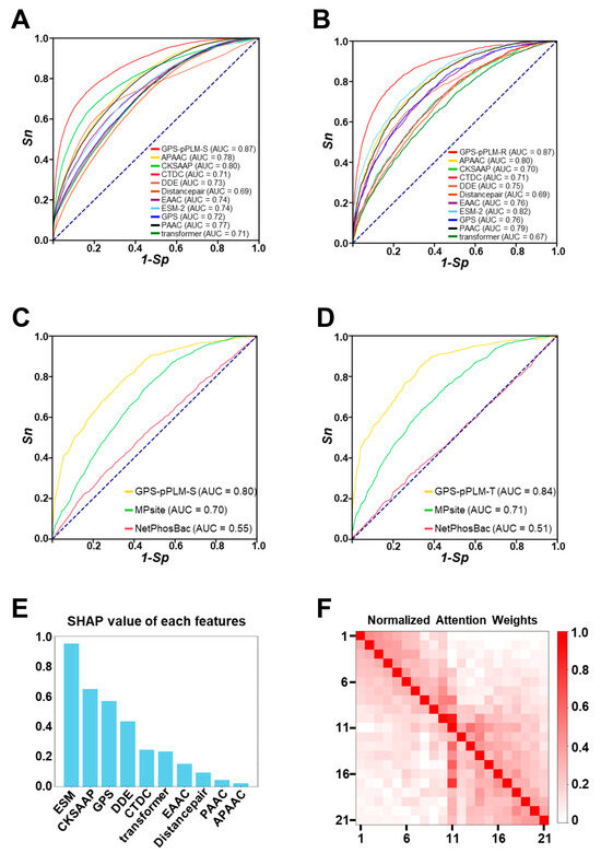 Performance evaluation and comparison of the GPS-pPLM. (A,B) Performance evaluation of the pS and pR predictors. The accuracies of the 10-feature models and integrated models were evaluated via a 4-fold cross-validation method. (C,D) Performance comparison between the GPS-pPLM and other existing predictors on the S p-site and T p-site independent testing data, including MPsite and NetPhosBac. (E) Evaluation of 10 types of features contributing to the O-phosphorylation model by measuring the SHAP score for each feature. (F) Visualization of normalized attention weights for the relationships between different positions in S/T p-sites.