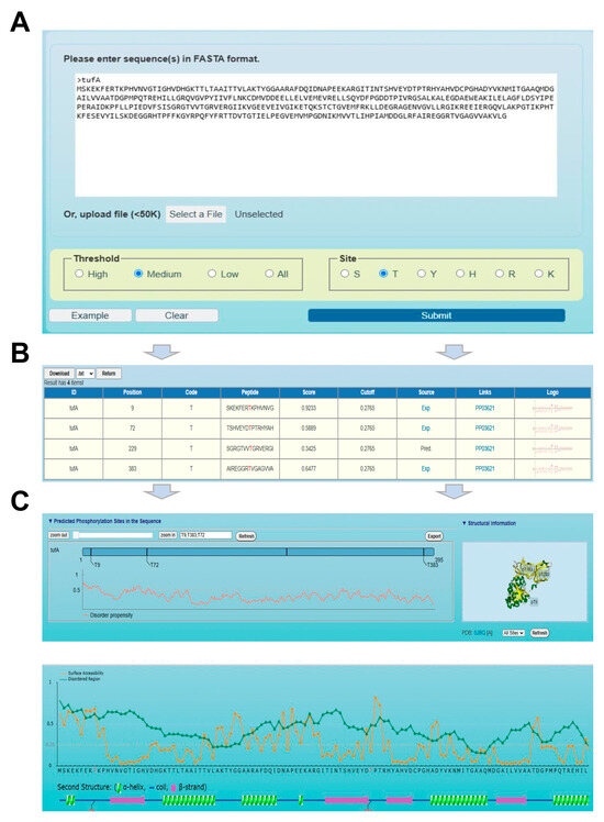 Usage of the GPS-pPLM web server. (A) The interface of sequence submission. Users can input protein sequences in FASTA format or enter UniProt accession numbers and select 3 different thresholds and 6 different residue types to predict p-sites. (B) Presentation of the prediction results of the example. In the tabular list, the predictive results include the position of the p-site, residue type, prediction score, cut-off value, identification via experimental or computational methods, and links to dbPSP 2.0. (C) Comprehensive annotations of the prediction results. The line chart shows the disorder score of the p-sites, and the location of the p-sites is explained in the 3D structure exported from the PDB database. The ASA score and disorder score of the p-sites are also calculated in the comprehensive mode.