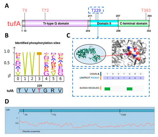 The prediction results for the E. coli protein tufA. (A) The T residues predicted as p-sites in the tufA protein, including T9, T72, T229, and T383. (B) Amino acid frequency of sequences containing VVT motifs at known p-sites and the amino acid sequence near T229. (C) The 3D structure of T229 and the annotation results from PDB. (D) Annotation of tufA p-sites. The disorder score was measured for the p-sites.
