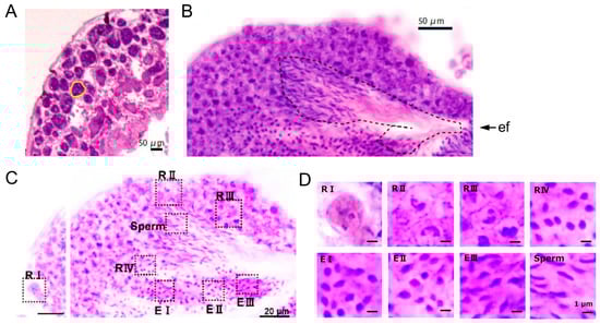 We initially examined HE-stained paraffin sections of the testes. The Ciona testis consists of numerous club-like compartments known as testicular follicles (Figure 1A). Each follicle was densely packed with spermatogenic cells at various developmental stages. As previously observed in Ciona [] and Botryllus [], spermatogenic cells were distributed from larger cells near the basal lamina to smaller, later-stage cells in the center, indicating that the testis is non-cystic rather than cystic. However, the alignment of spermatogenic cells is less strictly organized compared to the mammalian seminiferous tubules. Late spermatids and mature sperm were observed in the region from the center to the efferent duct (Figure 1B). Based on cell size (Figure 1C,D) and the immunohistochemical characterizations described below, we classified the spermatogenic cells into round stages (RI to RIV) and elongated stages (EI to EIII) (Table 1).