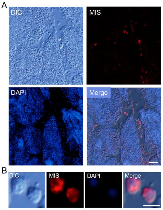 Immunofluorescence image of a frozen section stained with anti-Müllerian Inhibiting Substance (MIS) antibody. (A) MIS H-300 positive cells (red) are localized in the space between testicular follicles. Scale bar, 20 μm. (B) The cells located between follicles display a round shape. Scale bar, 5 μm. Blue, DAPI staining.
