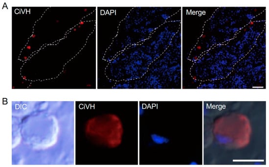 Immunofluorescence image of a frozen section stained with an antibody against Ciona robusta Vasa homolog (CiVH). (A) CiVH signals (red) are detected in a few large cells located along the basal region of a testicular follicle. Scale bar, 20 μm. (B) CiVH-positive cells appear round and large, likely representing primordial germ cells or spermatogonia (RI). The immunofluorescence signal was present throughout the cytoplasm but not in the nucleus (blue). Scale bar, 5 μm.