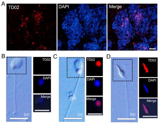 TD02 is another gene highly expressed in Ciona testis, showing homology to a histone H1-like protein involved in chromatin condensation during spermiogenesis [,]. An antibody against TD02 stained the nucleus of late spermatids and mature sperm in the central area of the testicular follicle near the efferent duct (Figure 5A). In isolated cells, the antibody recognized the nucleus of late spermatids and mature sperm but did not stain early spermatids (E1), even those with long flagella (Figure 5B–D). The appearance of the TD02 protein coincided with the onset of nuclear elongation, which began in spermatids with flagella measuring ~5.8 μm. Spermatids with flagella longer than 28 μm were all stained by the anti-TD02 antibody.
