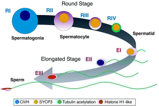 Prior to this study, no characterization of spermatogenic cells in the ascidian Ciona robusta had been conducted at the molecular level. Here, we characterized these cells using antibodies against acetylated tubulin, Müllerian Inhibiting Substance (MIS), Vasa homolog, and the laboratory-made testis-specific proteins TD02 and TD09. Spermatogenic cells were classified into four round stages (RI to RIV) and three elongated stages (EI to EIII) (Figure 8). Based on previous morphological studies [,,,,], cells in stages RI, RII/RIII, and RIV/EI/EII/EIII are identified as spermatogonia, spermatocytes, and spermatids, respectively. These antibodies clearly recognized structures specific to each stage, demonstrating that the method described here can be useful for further characterization of spermatogenic cells.