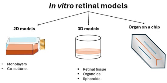 A novel method for studying retinal diseases is based on the development of models derived from stem cells. When cultured under an appropriate stimulus, stem cells have the ability to differentiate into different retinal cells widely used in regenerative therapy [105,106]. They are mainly employed as precursors of photoreceptors and RPE cells, and they are valuable tools for creating complex models ranging from co-cultures to 3D structures and organoids of retinal tissue.