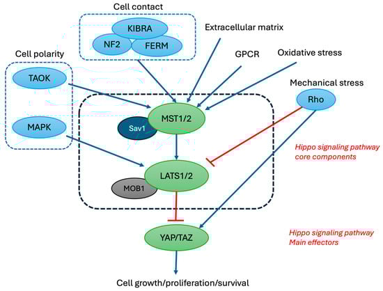 The core components of the Hippo signaling pathway are regulated by several different upstream signals. They can be activated by cell-to-cell contact through the FERM domain proteins, Neurofibromatosis type-2 (NF2), and the WW and C2 domain-containing protein renal and brain expressed protein (KIBRA) [,,]. Changes in cell polarity can also activate the Hippo signaling pathway through TAOKs by phosphorylating MST1/2 and MAPK by phosphorylating LATS1/2 [,]. Furthermore, mechanical stress induces cytoskeleton reorganization, which leads to the activation of the Hippo signaling pathway, primarily through the modulation of LATS1/2 activity by Rho GTPases []. Changes to the extracellular matrix, GPCRs, and oxidative stress are additional potential factors that influence the Hippo signaling pathway [,].