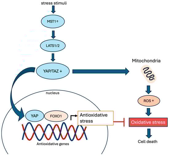 In keeping with those findings, some studies have shown that MST1/2 is activated by hydrogen peroxide (H2O2) in the cellular oxidative stress response [,]. Interestingly, the stress response due to the stimulation of the Hippo signaling pathway might involve other proteins or pathways, such as FOXO1, AMPK, and TOR [].