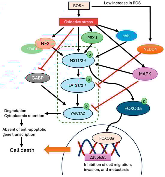 To further control responses to oxidative stress, the Hippo signaling pathway interacts with transcription factors known as Forkhead box O (FOXO). FOXO1 and YAP work together to control antioxidant gene expression when ROS stimulate its nuclear translocation []. Through this interaction, the Hippo signaling pathway helps in the cellular defense mechanism against ROS (Figure 3). Using different cellular models, Wang et al. revealed that ROS can induce MST1/2 activation []. Then, MST1/2 causes FOXO3a phosphorylation, resulting in a higher expression of ΔNp63α, which is a direct transcriptional target of FOXO3a. This mechanism will subsequently reduce cell migration. Interestingly, this modulatory pathway involving ROS-MST1/2—FOXO3a and ΔNp63α—is independent of YAP activation, which supports the idea of non-canonical Hippo activation by ROS [].