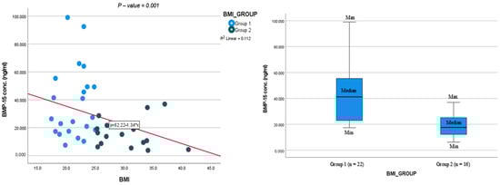 Scatterplot and boxplot correlation of BMP-15 and BMI.