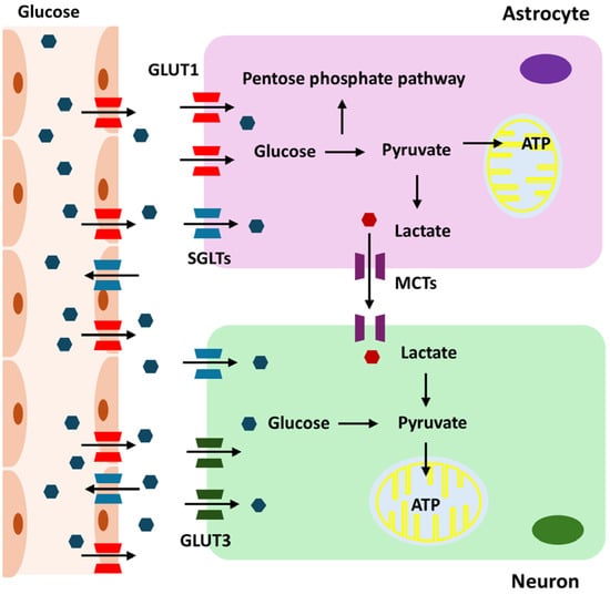 The brain has mechanisms to maintain glucose homeostasis. In cases of hypoglycemia, the brain prioritizes glucose uptake to protect neuronal function. Conversely, in hyperglycemia, the brain’s glucose uptake can become saturated, limiting further increases in brain glucose levels [20]. In individuals with diabetes, fluctuations in blood glucose levels can lead to corresponding changes in brain glucose levels, impacting cognitive function and potentially contributing to neurological complications. Acute hypoglycemia can significantly reduce brain glucose levels, leading to impaired cognitive function, seizures, and, in severe cases, neuronal damage [21]. Chronic hyperglycemia can lead to changes in the BBB and glucose transport mechanisms, potentially impacting brain health and increasing the risk of neurodegenerative diseases [22]. Astrocytes in the brain mainly carry out glycolysis, which is the process of converting glucose into lactate. This lactate is subsequently released to meet the energy requirements of neurons, especially during times of high demand or hypoxia [23]. Neurons take up this lactate through monocarboxylate transporters (MCTs), particularly MCT2, and convert it back into pyruvate, which enters the mitochondria for further energy production [24]. Neurons employ pyruvate from lactate or glycolysis to power mitochondrial ATP synthesis via oxidative phosphorylation, whereas astrocytes use the pentose phosphate pathway (PPP) to produce NADPH for antioxidant defense [25]. Under conditions of high metabolic demand, essential enzymes such as 6-phosphofructo-2-kinase/fructose-2,6-biphosphatase 3 (PFKFB3) can become compromised, limiting glycolysis in neurons and highlighting the need for astrocyte support [26]. Consequently, neurons predominantly rely on lactate from astrocytes for ATP production. The exact proportion of ATP derived from direct glycolysis versus astrocyte-supplied lactate varies depending on metabolic conditions and activity levels. During high neuronal activity, the reliance on astrocyte-derived lactate increases, highlighting the importance of the astrocyte–neuron lactate shuttle in supporting sustained neuronal function [27,28].