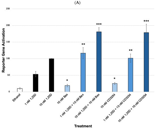 After 22–24 h of transfection, the cells were dosed with the negative (vehicle) ethanol (EtOH) control, vitamin D, and/or the appropriate RXR agonist. All the compounds were solubilized in ethanol to acquire the targeted concentration of vitamin D and rexinoid. The concentrations ranged between 1 and 10 nM, as indicated in the various data figures.
