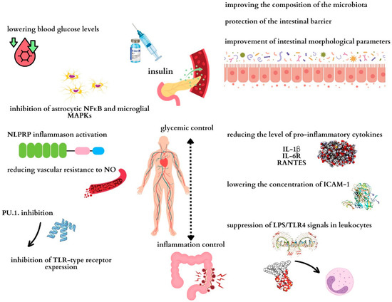 As available data indicate, insulin can exert homeostatic and anti-inflammatory effects in the human body. However, the molecular mechanism by which insulin can reduce inflammation in the body is still not fully understood. There are likely several potential mechanisms by which insulin may reduce inflammation in the body. One of them is its ability to lower blood glucose levels [39]. Hyperglycemia in diabetes may induce toxicity due to the greater flow of glucose through the glycolytic pathway [40]. Additionally, hyperglycemia caused by oxidative stress and cytokine release leads to the expression of cell adhesion molecules on activated endothelial cells in diabetic patients [41]. As a result of oxidative stress, mitochondria become damaged and a number of factors are activated, including the activation of TLRs, which may lead to the dysfunction of pancreatic β-cells [42]. Previous findings have already shown that insulin can inhibit the expression of TLRs at the transcriptional level, probably through its inhibitory effect on the PU.1 transcription factor [43].