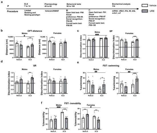 Our findings indicate that exposure to ELS led to a depressive-like phenotype in adult rats of both sexes. In males, ELS exposure led to reduced locomotion, decreased swimming behavior, and increased immobility. In females, ELS decreased swimming behavior and increased immobility. Treatment with URB597 during late adolescence reversed these effects in both sexes. These results align with previous studies from our lab, which validate the LBN paradigm for assessing the association between ELS and depressive-like phenotype in adulthood and demonstrate that the FAAH inhibitor URB can counteract depressive-like symptoms induced by ELS [27,33,34,38].