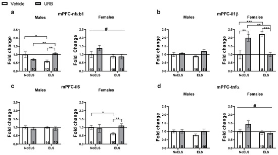In males (Figure 4a, left), a two-way ANOVA revealed a significant effect of drug (F(1,43) = 4.403, p = 0.042) and the ELS × drug interaction (F(1,43) = 4.25, p = 0.045), while no significant effect of ELS was found (F(1,43) = 0.67, p = 0.417). An independent-samples t-test indicated a significant downregulation of nfκb1 in the ELS-URB group compared to the ELS-Vehicle group (t(29) = 3.541, p = 0.001).