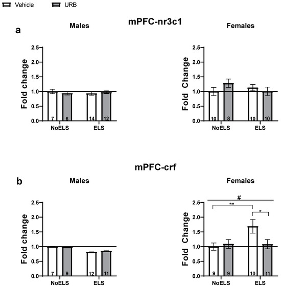 In females (Figure 3b, right), a two-way ANOVA with a log link function identified significant effects for ELS (X2(1) = 3.95, p = 0.047) and the ELS × drug interaction (X2(1) = 4.15, p = 0.042), with no significant effect for drug (X2(1) = 1.97, p = 0.16). ELS was found to upregulate crf expression compared to the NoELS groups. An independent-samples t-test indicated a significant upregulation of crf in the ELS-Vehicle group compared to both the NoELS-Vehicle (t(35) = −2.764, p = 0.009) and ELS-URB (t(35) = −2.455, p = 0.019) groups, suggesting that URB normalized the ELS-induced upregulation of crf.