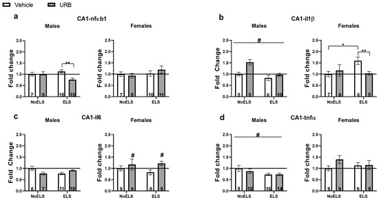 In females, ELS resulted in a persistent upregulation of CA1-il1β expression starting from P45. Importantly, this upregulation was reversed with URB treatment, further supporting the therapeutic potential of URB in mitigating the neuroinflammatory effects of ELS. Our finding is consistent with studies showing that ELS increases IL1β expression in the hippocampus [17,49].