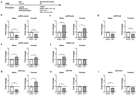 ELS upregulated crf expression compared to the NoELS group in males (t(12) = 2.72, p = 0.019). No significant difference was found between the groups in females (Figure 5f, right).